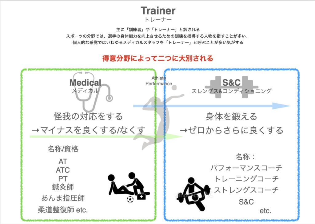 一般的にスポーツ現場でトレーナーと呼ばれる職業の人は得意分野に応じて大きく二つ分けられます。